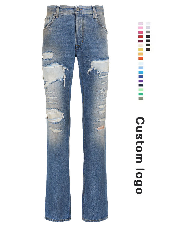 YKMOZI Custom Men's High Street Light Blue Denim Jeans Slim Straight Loose Fit Pants with Distress Destroy Detail Trousers