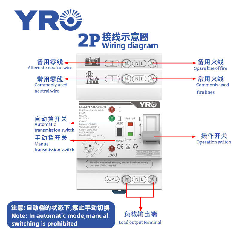 YRO Automatic Transfer Switch 2P 63A Single Phase Low Voltage ATS YRQ4PC-63N/2P PC Model