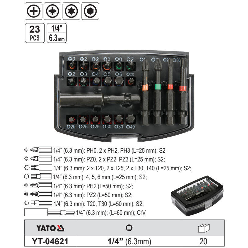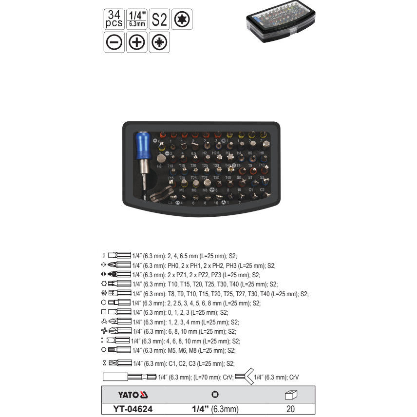 Yato Socket Set 1/4 In Hex Phillips Pozidriv Torx Slotted Automotive Repair Kit