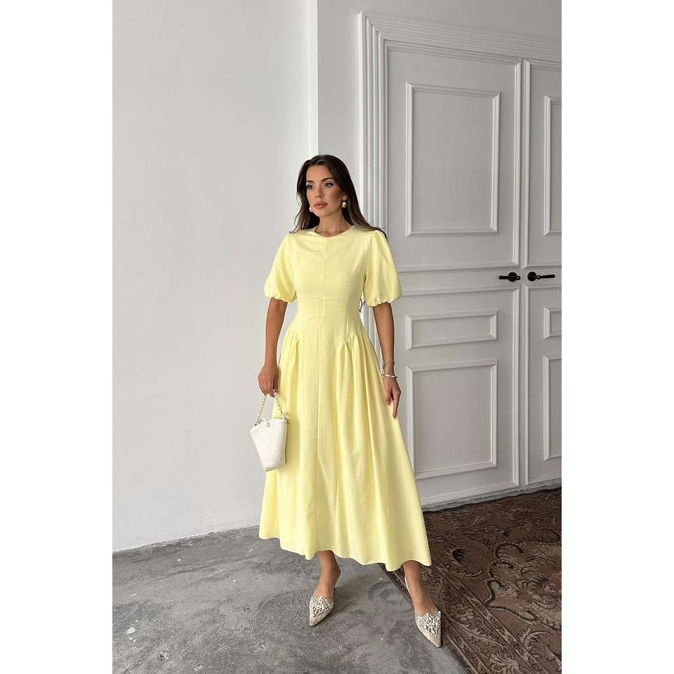Yellow A-Line Linen Dress O-Neck Puff Sleeve Breathable Wrap Tie Midi Length Women's Dress