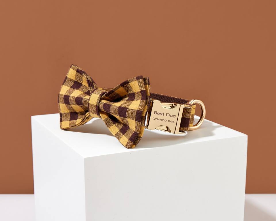 Yellow Check Personalized Bow Tie Set, For Boy Dog, Wedding Dog Collar,Puppy Collar And Lead Bow, UK Free Shipping