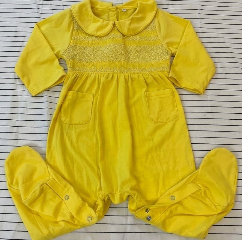 Yellow Cotton Smocked Baby Romper Long Sleeve Footed Sleepsuit Hand Embroidered Vintage Infant Jumpsuit With Pockets