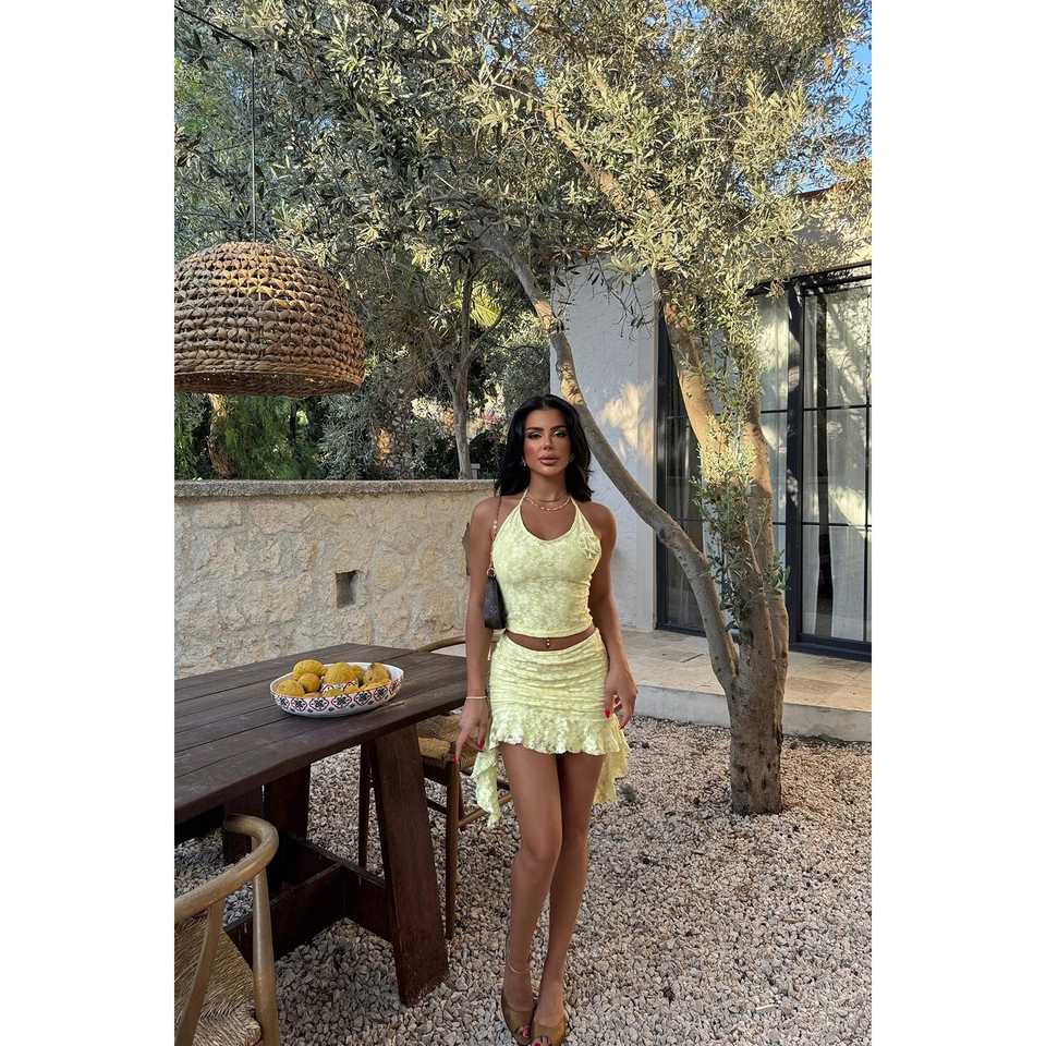 Yellow Darrel Lace Set High Quality Cotton Polyester Woven Fitness Sportswear Knee Length Short Tops Shorts XL Size Printed