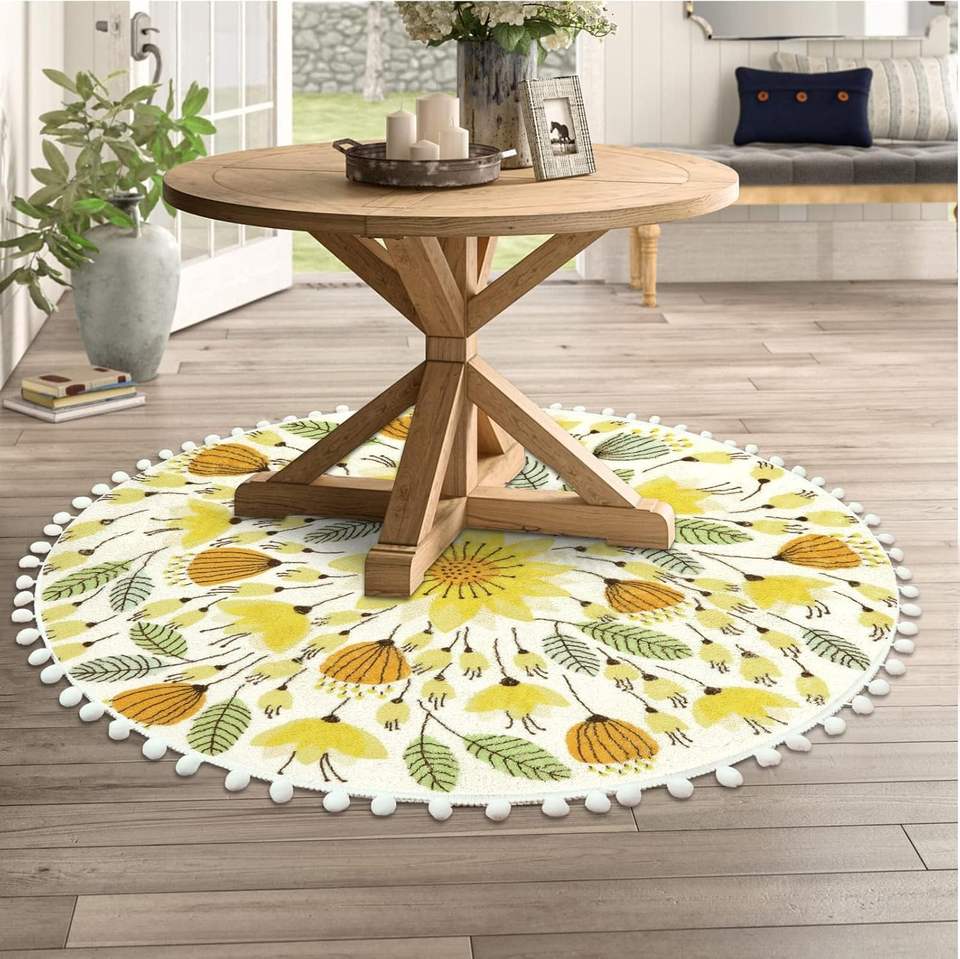 Yellow Fall Floral Round Rug with Pom Poms Washable Non-Slip Soft Carpet Print on Demand for Bedroom Room