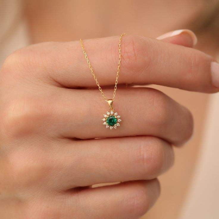 Yellow Gold Emerald & Diamond Halo Pendant Necklace Round Cut Green Emerald Center Stone with Dainty Diamond Jewelry for Women