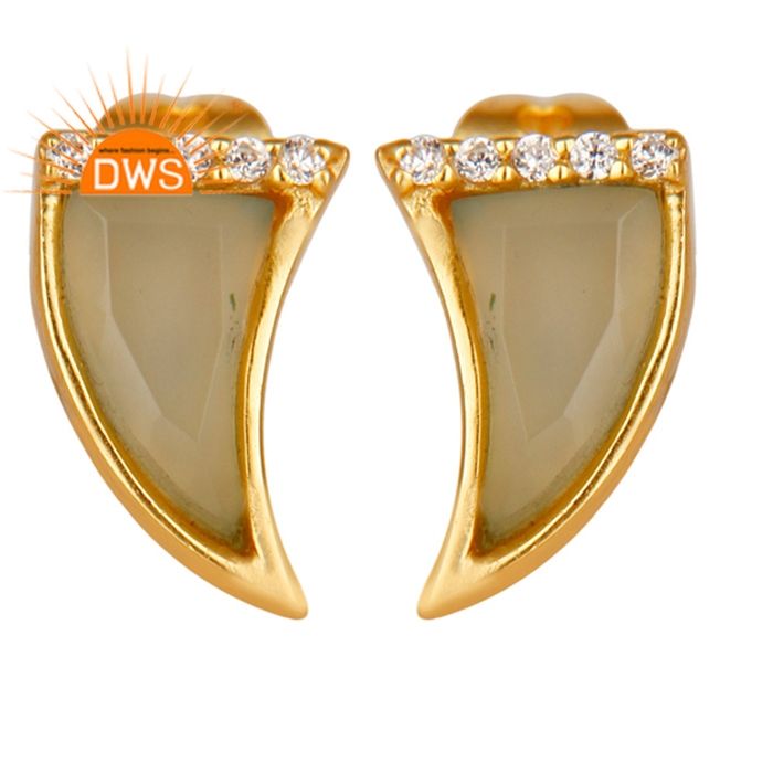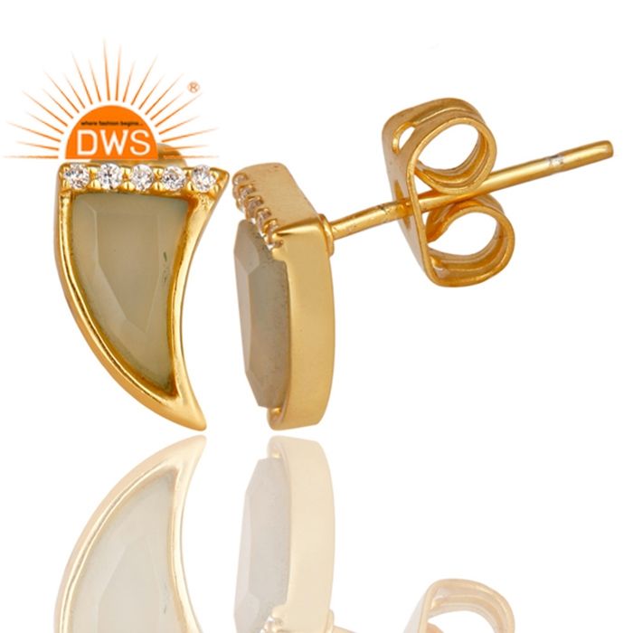 Yellow Gold Plated Sterling Silver Stud Earring Jewelry Horn Design Aqua Chalcedony CZ Gemstone Earring Jewelry Supplier