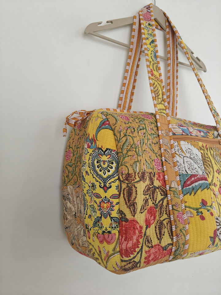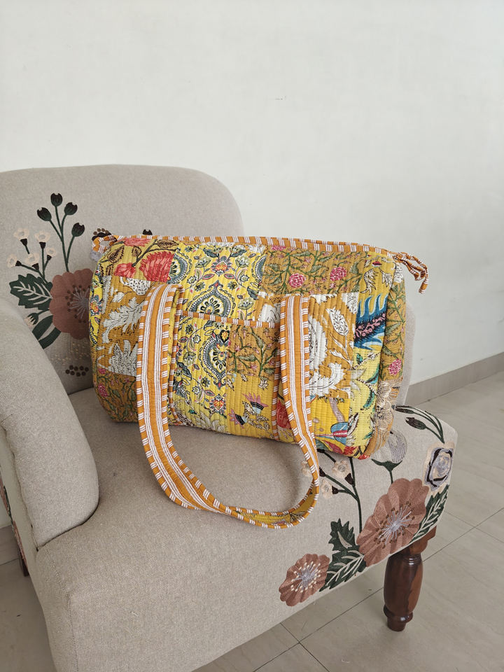 Yellow Handcrafted Floral Quilted Duffle Bag Vibrant Patchwork Boho Travel Tote with Vintage Charm Casual Artisan Touch