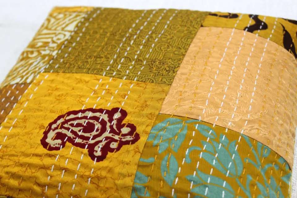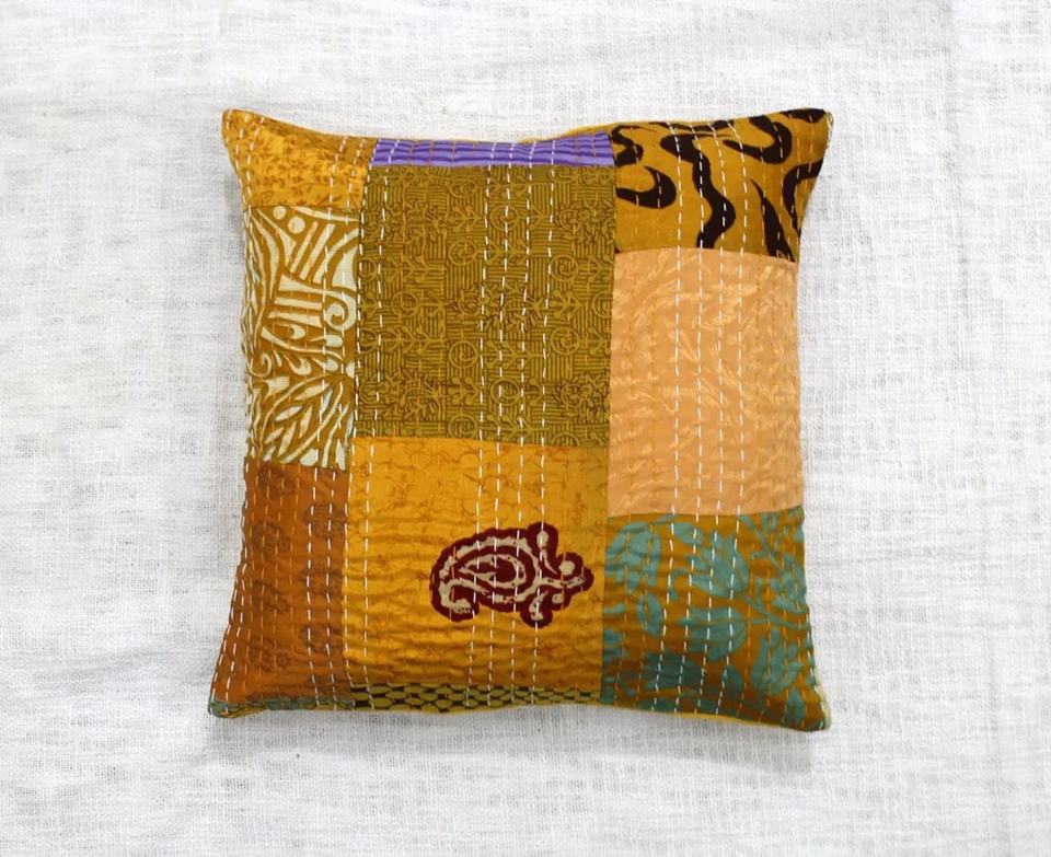 Yellow Kantha Pillow Covers Indian Patchwork Sari Pillow Boho Kantha Cushion Cover