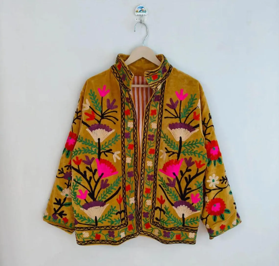 Yellow Suzani Embroidery Velvet Jacket Vintage Boho Coat Unisex Winter Jacket Ethnic Chic Outerwear