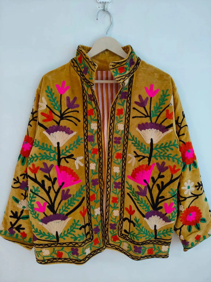 Yellow Suzani Embroidery Velvet Unisex Winter Jacket Vintage Boho Chic Outerwear Floral Pattern Cotton Filled Ethnic Style Coat