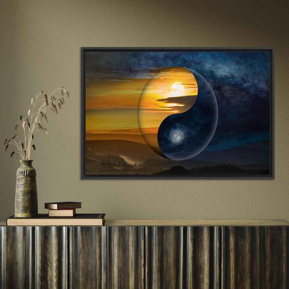 Yin Yang Canvas Art: Tempered Glass Print, Light & Shadow Decor,BLACK FRAMED CANVAS