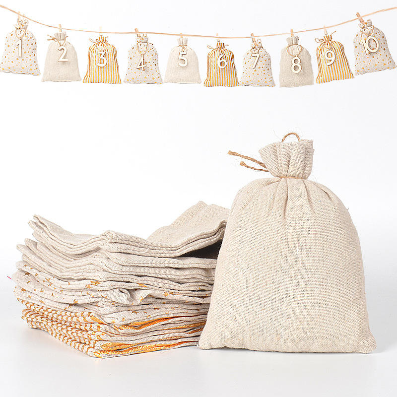 Yiwu New Hot Stamping Recyclable Jute Christmas Gift Bag Set with Wooden Hang Tag and Arrival Calendar