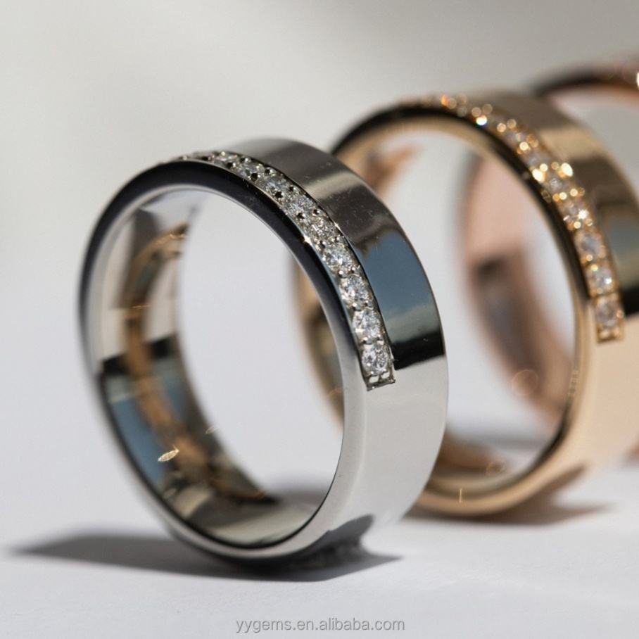 Yu Ying Custom 18K Solid Gold Flat Style Band Offset Halfway Pave VVS Moissanite Diamonds Wide Band Fine Jewelry Rings Band