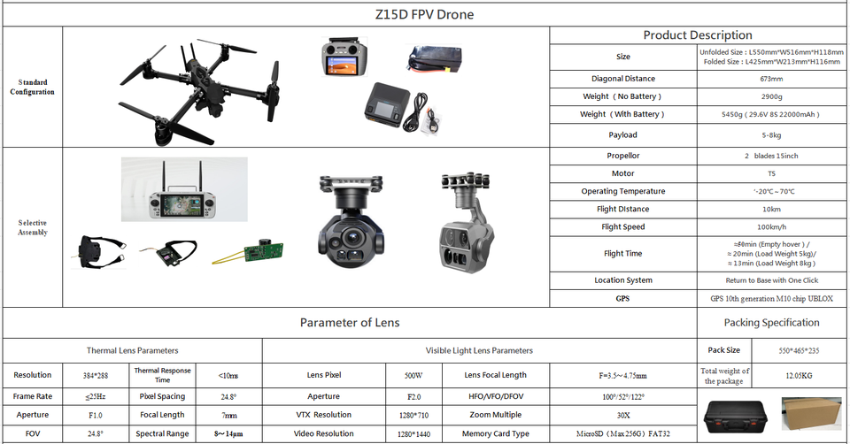 Z15D 15-in FPV Drone Throwable 8kg Load Capacity Long Range AI Tracking GPS Thermal Imaging Racing Drone Follow Me Batteries