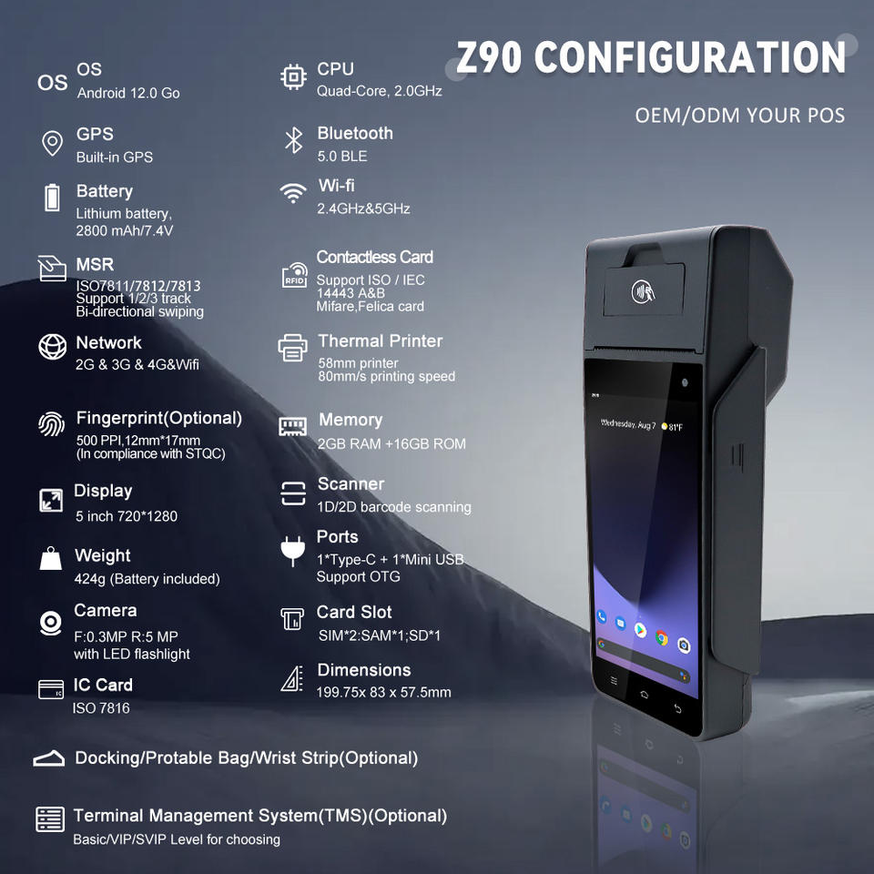Z90 Handheld POS Terminal Touch Screen With In-built Thermal Printer QR Code Scanner Free SDK Online Food Ordering POS Machine