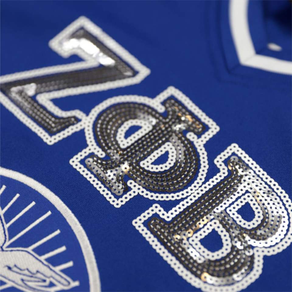ZPB Football Jersey - Royal Blue 100% Polyester Zeta Phi Beta Jersey with Embroidered Logos & Shield V-Neck, Striped Sleeves