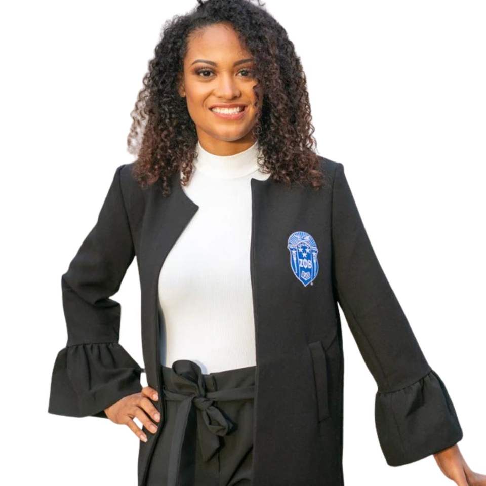 ZPHIB Black Bell Sleeve Jacket with Embroidered Shield for Sorority Conferences and Formal Occasions