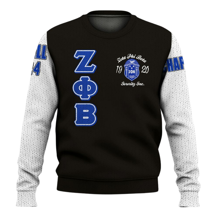 ZPhiB Sorority 1920 Winter Knit Sweater Zeta Phi Beta Blue White Greek Life Front Chenille Patch Premium Letter Top