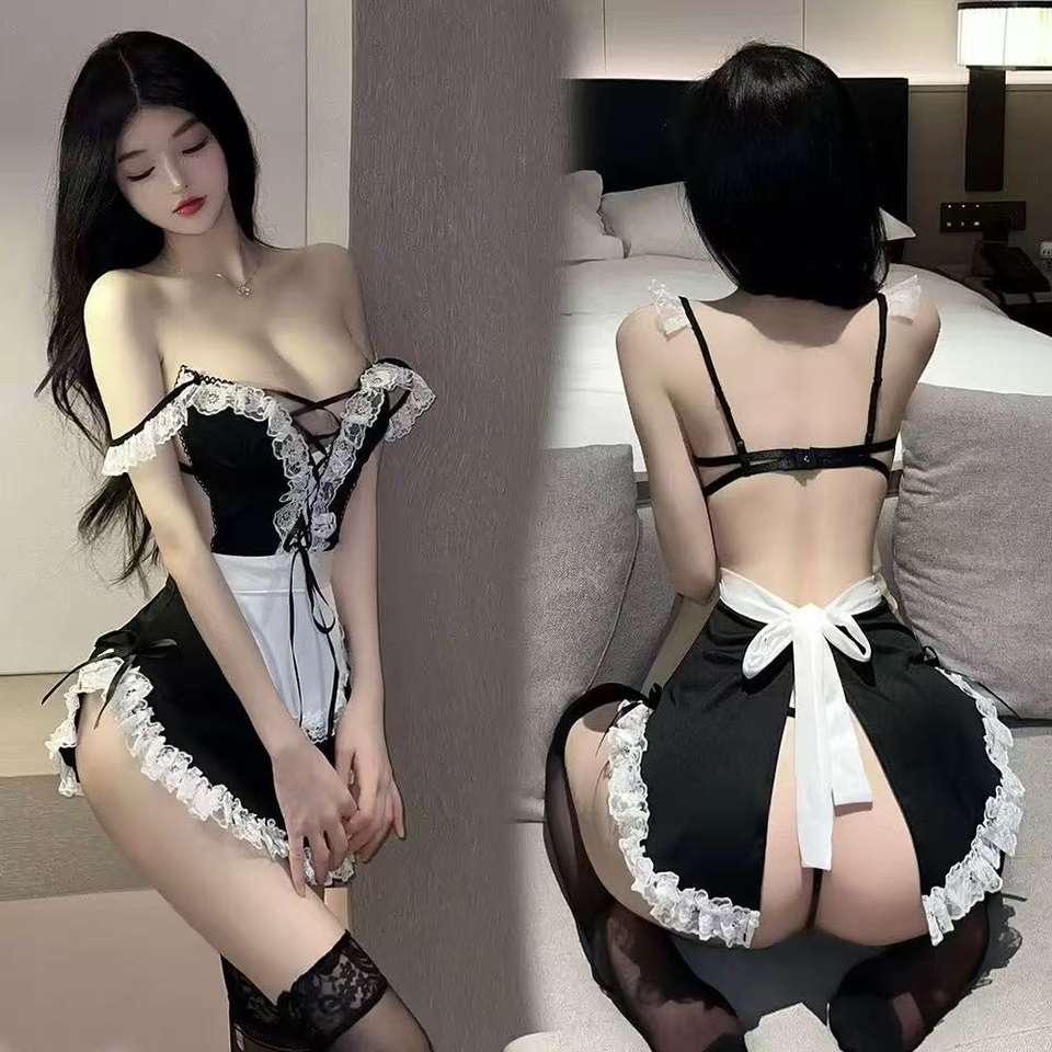 ZZYUP 6967KN Women Sexy French Maid Cosplay Uniform Sheer Lace Japanese Costume Lingerie Short Dress Set Light Control