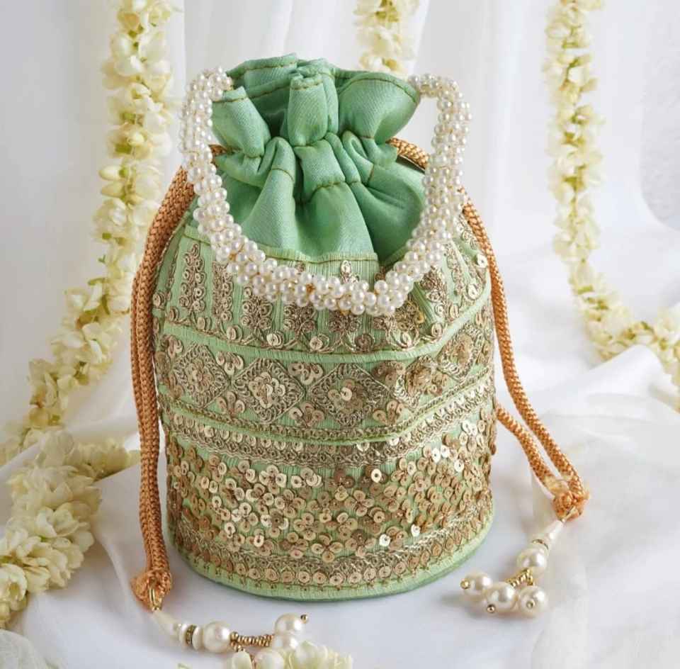 Zari Round Potli with Pearl Handle & Tassels Woman Drawstring Potli Bag Evening Clutch Wedding Return Gift Bags