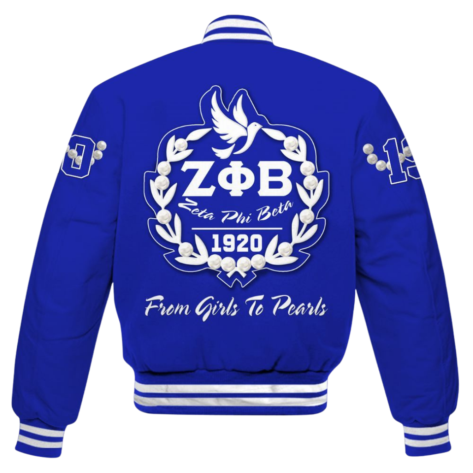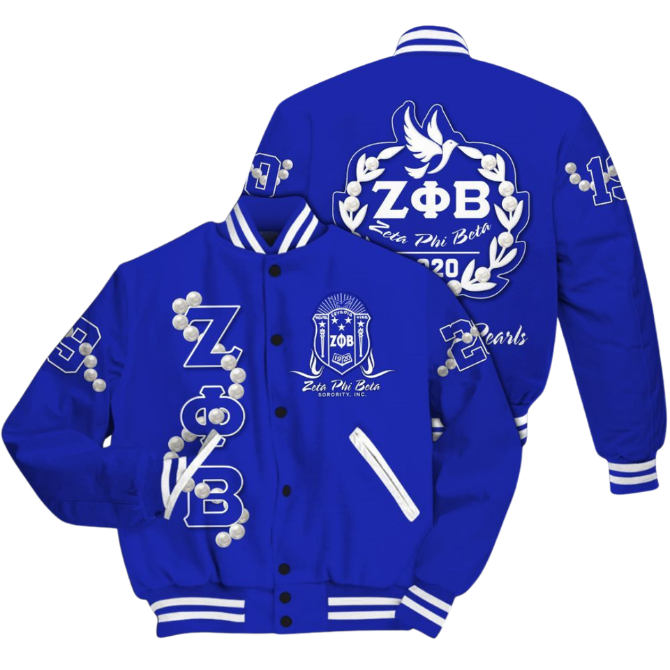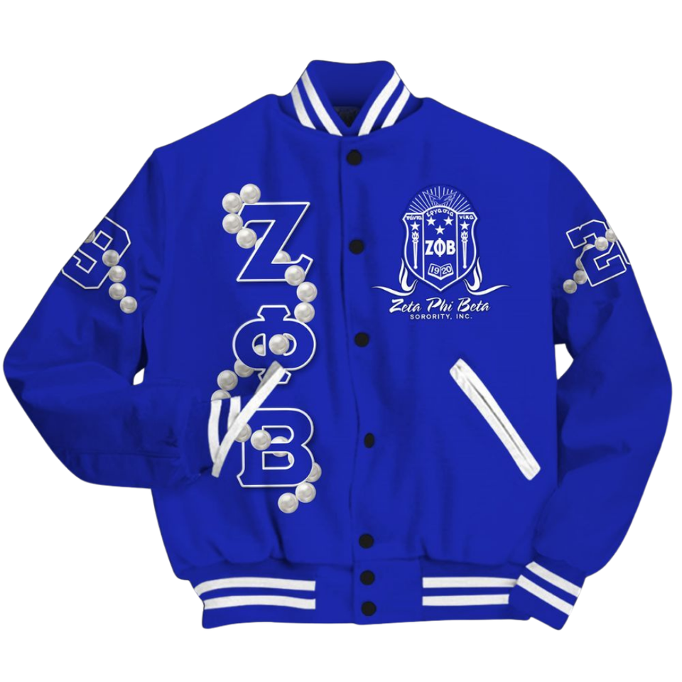 Zeta Phi Beta 1920 Coated Letterman Jacket Blue White Sorority Varsity Chenille Patch Front ZPB Greek Life