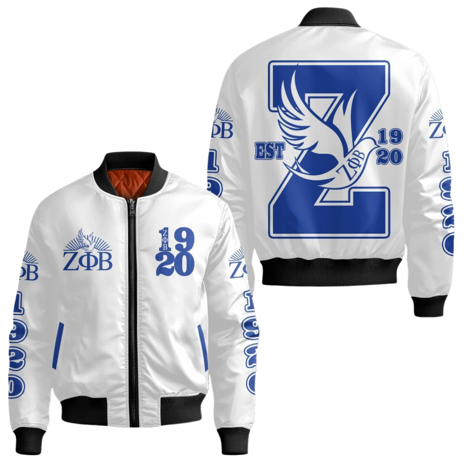 Zeta Phi Beta Blue White Satin Jacket Womens Sorority Greek Apparel ZPB 1920 Shield Embroidery Premium Varsity Outerwear