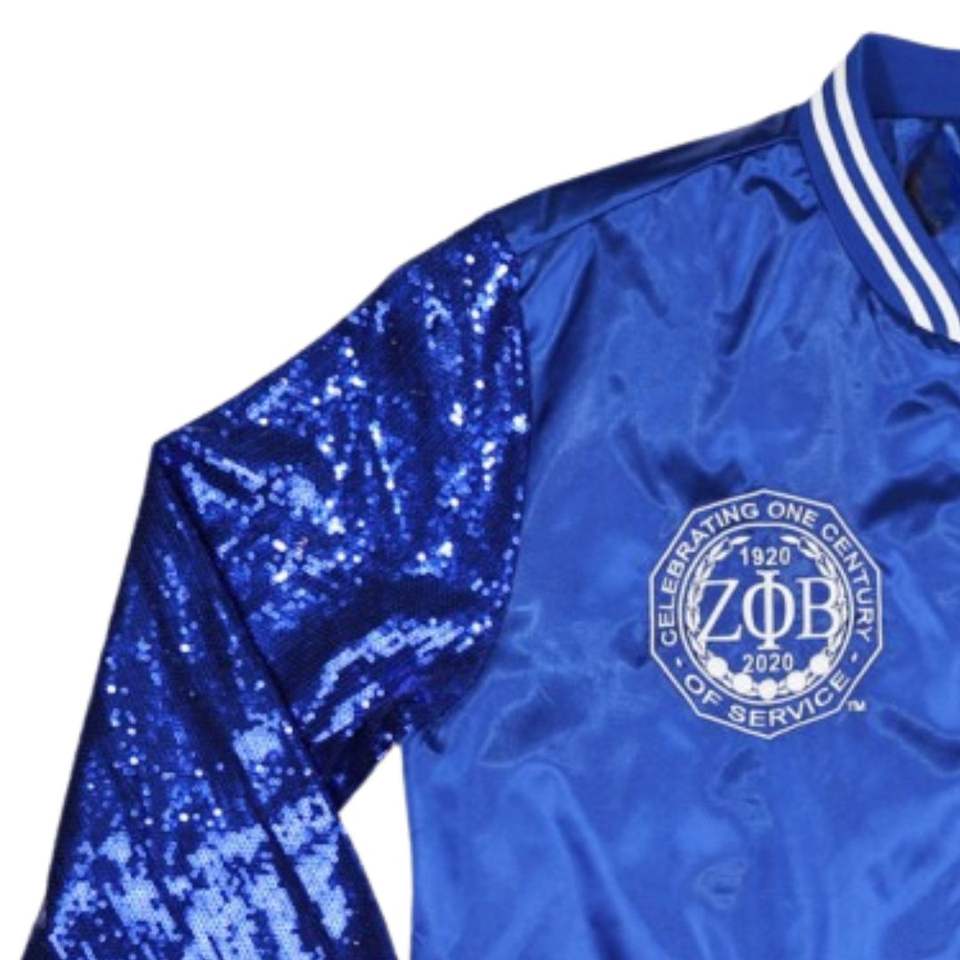 Zeta Phi Beta Sorority Centennial Sequin Puffer Jacket Custom Embroidered Greek Life Apparel Shiny Varsity Party Canvas Stand
