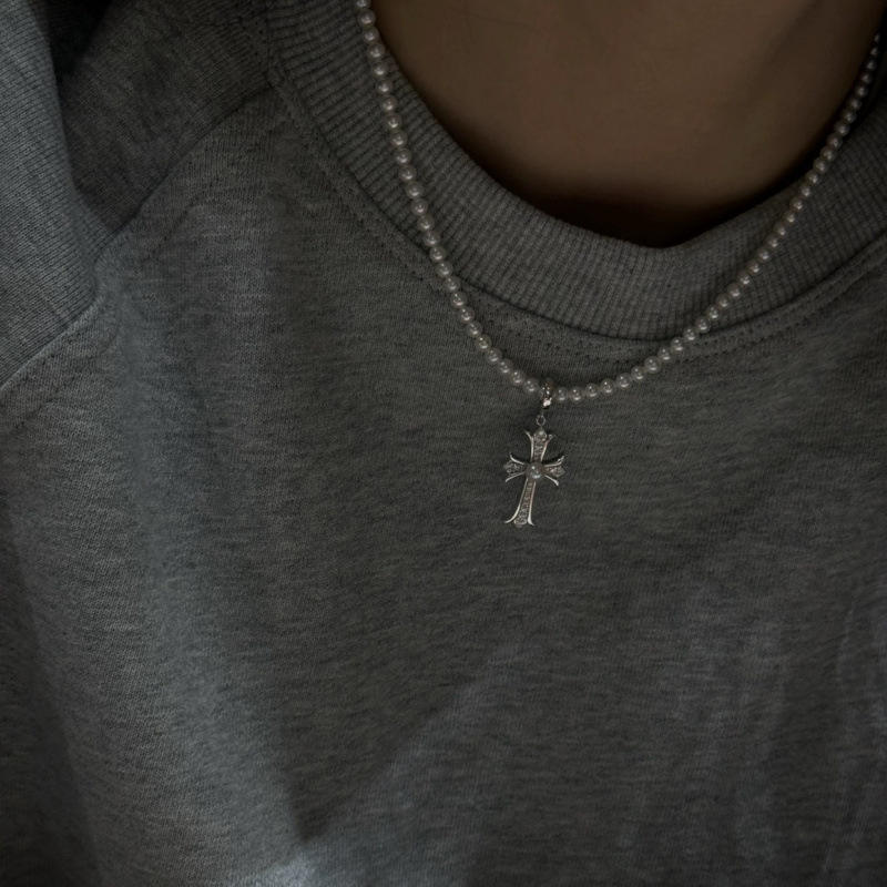 Zhuji 3-4MM Round Flawless Freshwater Pearl Necklace S925 Silver Cross Retro Punk Style Fashion Pendant Necklace