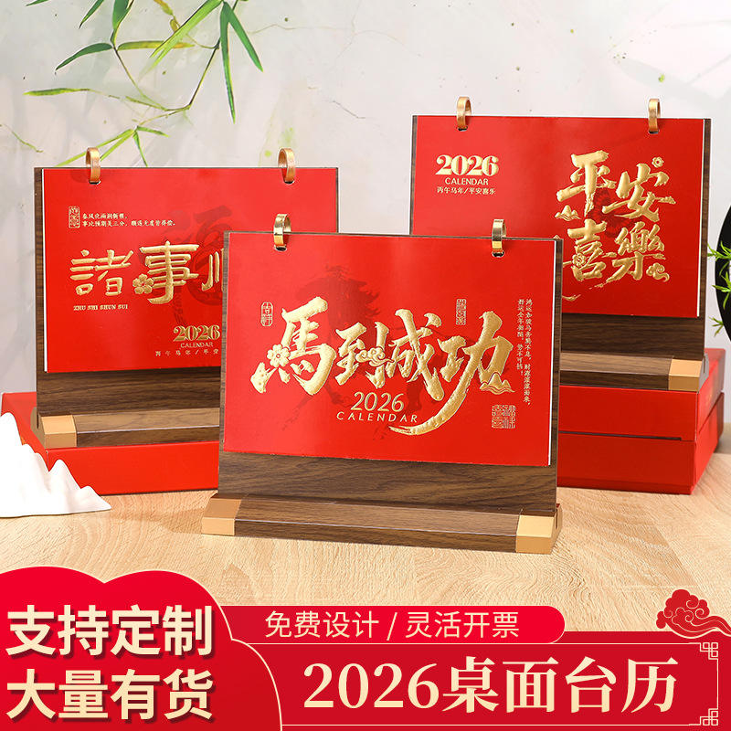 Zhuorui Stationery 2026 Table Calendar Wooden Frame Chinese Style Gold Foil Embossing Desktop Ornament Business Gift