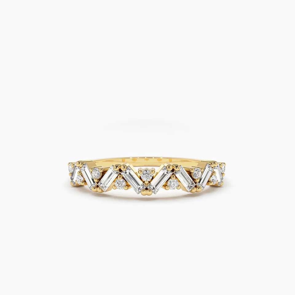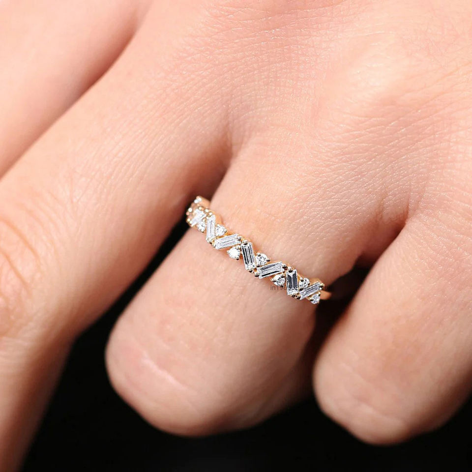 Zig Zag Baguette & Round Moissanite Half Eternity Wedding Band Dainty Stackable Ring for Women Unique Bridal or Anniversary Band