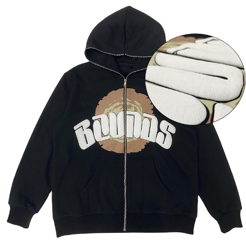 Zip Collar Men's Full Zip 3D Powder for Puff Print Hoodie Black Heavy Duty 100% Cotton with Embroidered Technics