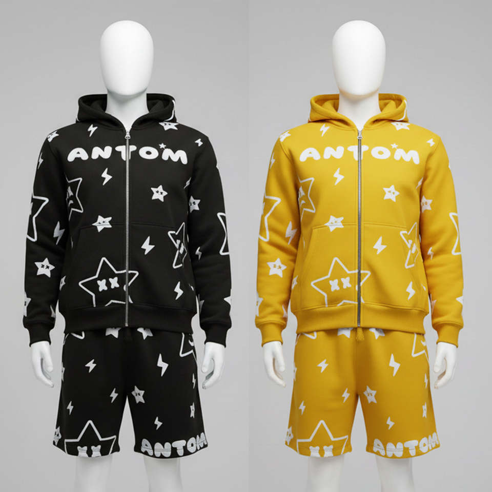 Zip up Hoodies and Shorts Set Custom Logo Two Piece Sweat Suit All Over Puff Printing Tracksuit Hoodies and Shorts Set Men