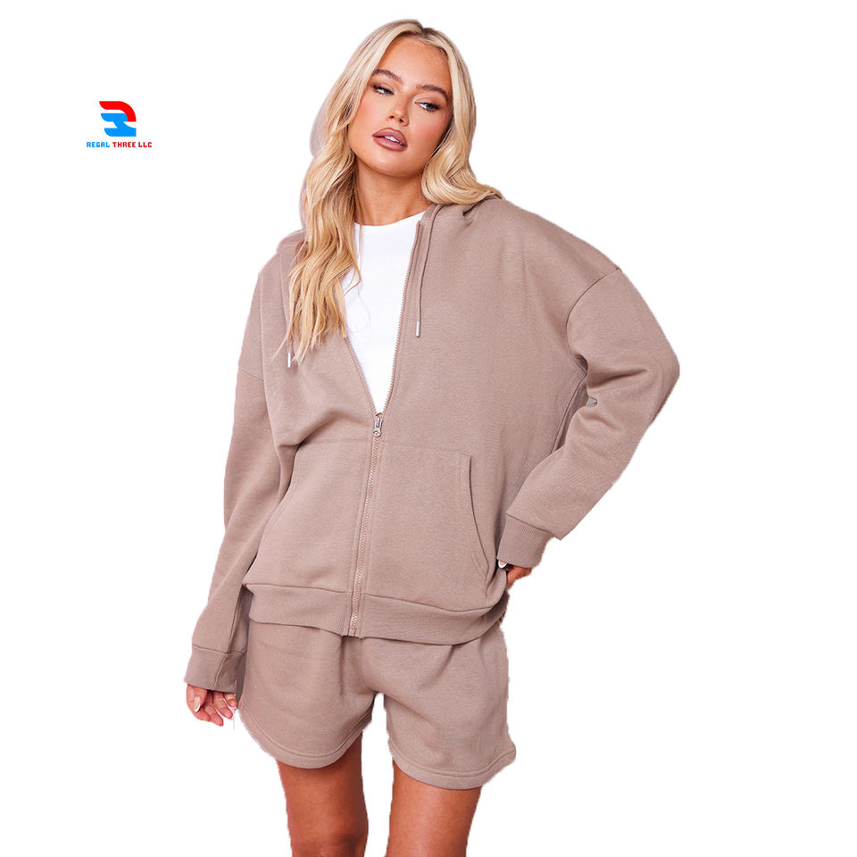 Zip-Up Printed Breathable Windproof 2-Piece Unisex Women's Tracksuit Set with Long Sleeve Hoodie & Shorts for Fitness