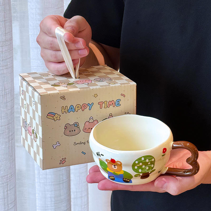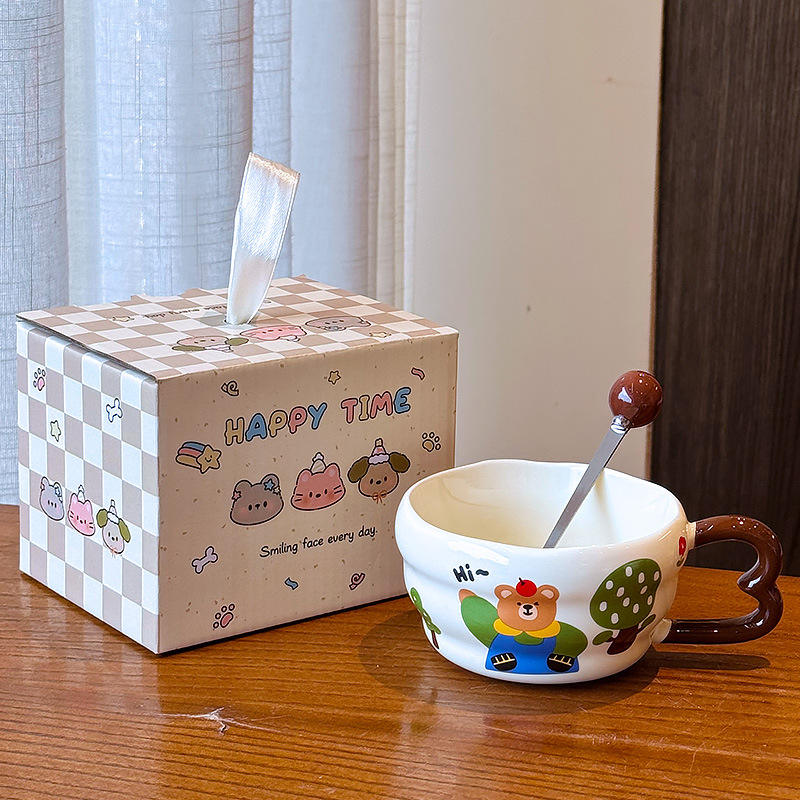 Zuo Mu Creamy Bear Ceramic Mug With Spoon Microwave Safe Heat Resistant Cartoon Coffee Mug For Breakfast Milk Gift
