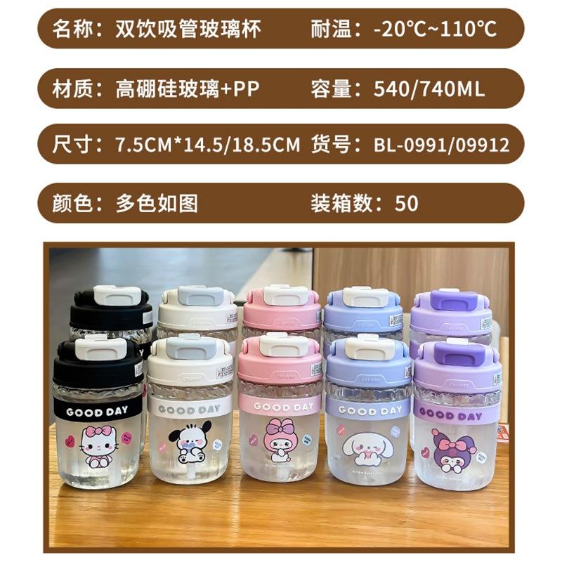 Zuo Mu Double Straw Glass Cup 540/740Ml High Borosilicate Heat Resistant Student Water Bottle With Cover Back To School