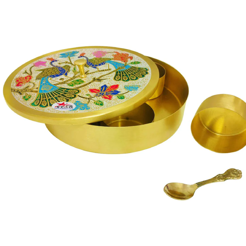 a classic Indian spice box with a stunning, hand-painted lid,The lid is a striking black, adorned with an colorful floral