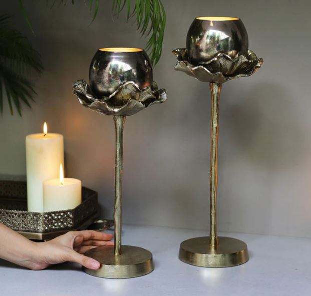 aluminium stand the glass votive holder has a dark glass finish on top and the metal stand is made of sturdy aluminium that
