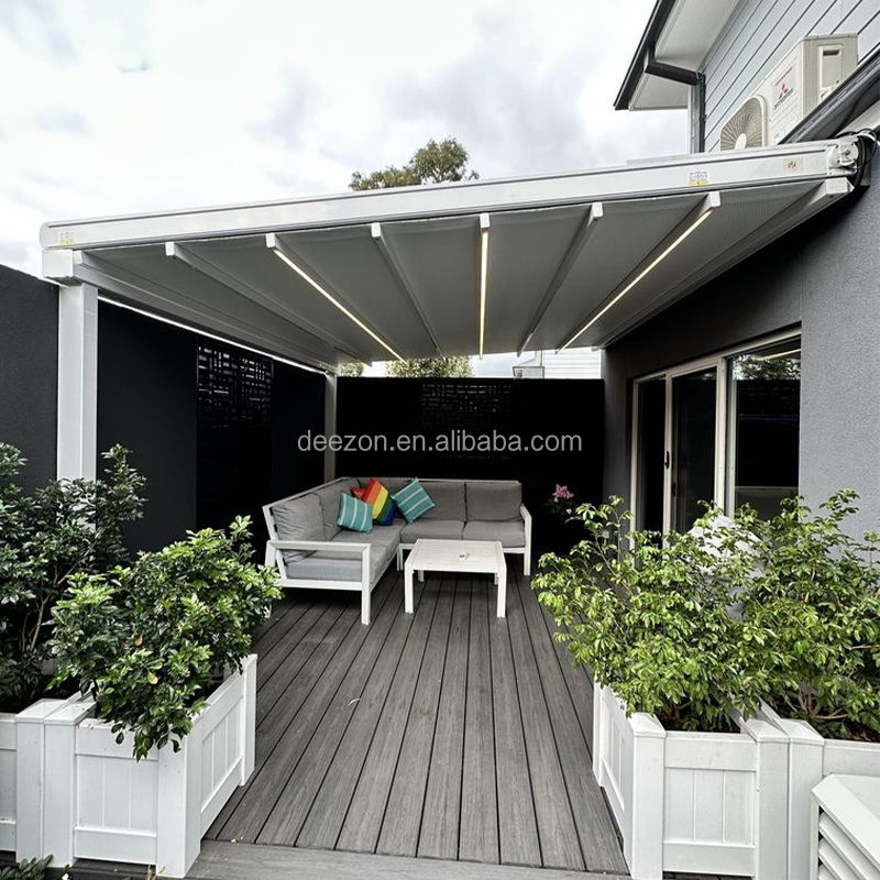 Outdoor, Commercial, Sun Protection, Sunshade, retractable awning, Water Proof, Electric, Decorative, Rain Protection, Terrace, gazebo, Led Lighting, outdoor patio, outdoor garden, motorized pergola awnings, UV Protection, Coffee Shop, Swimming Pool, Residential, VillaApplication