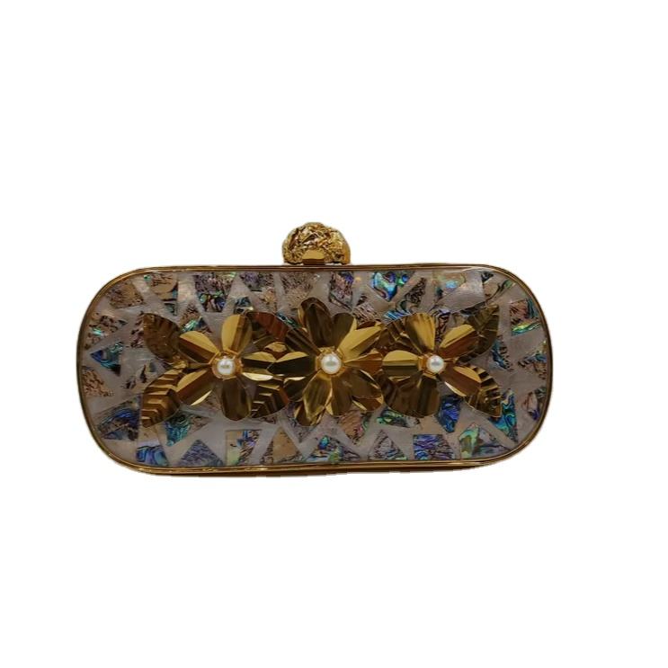 andcrafted Mother of Pearl Oval Clutch with Gold Floral Metalwork Pearl Accents Luxury Evening Wedding Party Statement Bag