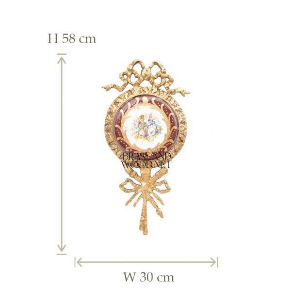 antique brass decorative ornate frame with porcelain floral bouquet painting red background ribbon design vintage home decor