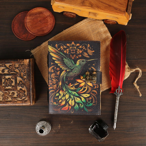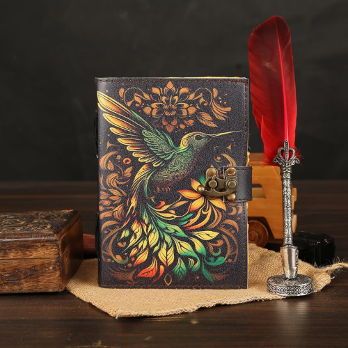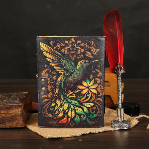 beautifully handcrafted leather diary featuring a vibrant embossed hummingbird design on the cover giving the diary an elegant