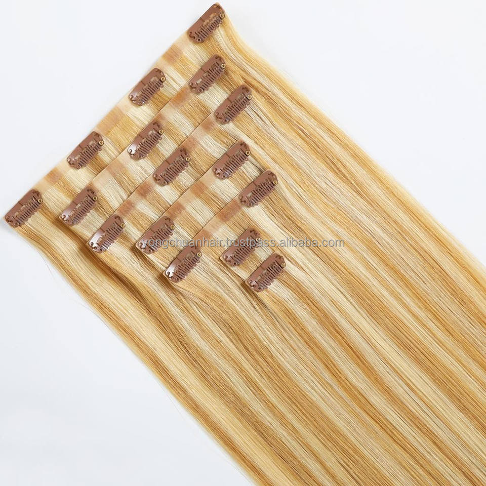 Blonde Seamless Russian Clip Real Human Kinky Straight Hair Extensions Natural Wave Invisible Adhesive Invisible Weft