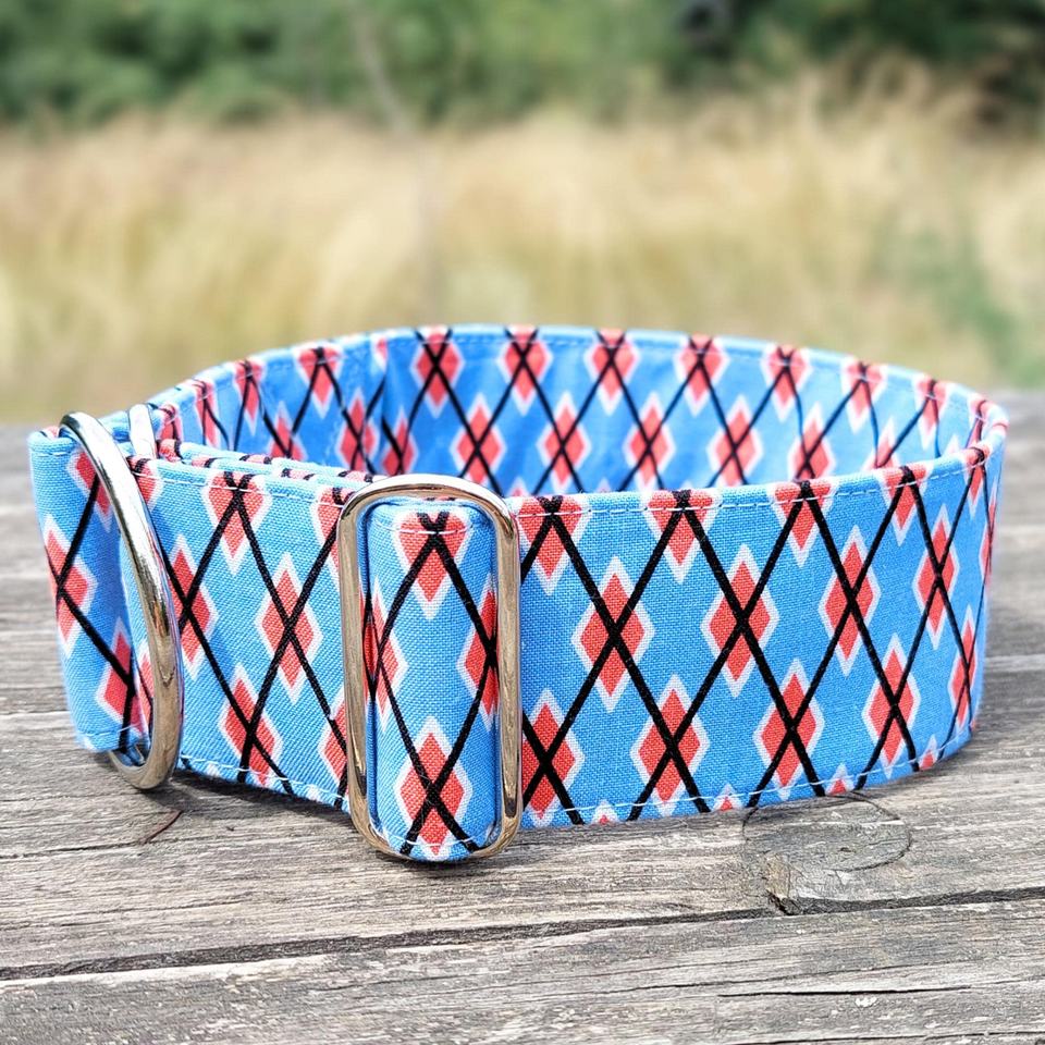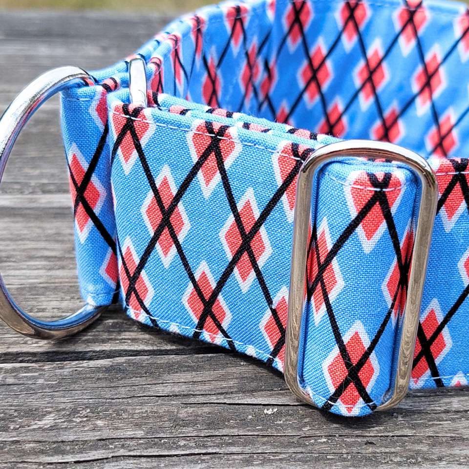 blue and red argyle pattern, limited slip martingale or buckle, sighthound Whippet, boy dog collar, plaid collar / Argyle