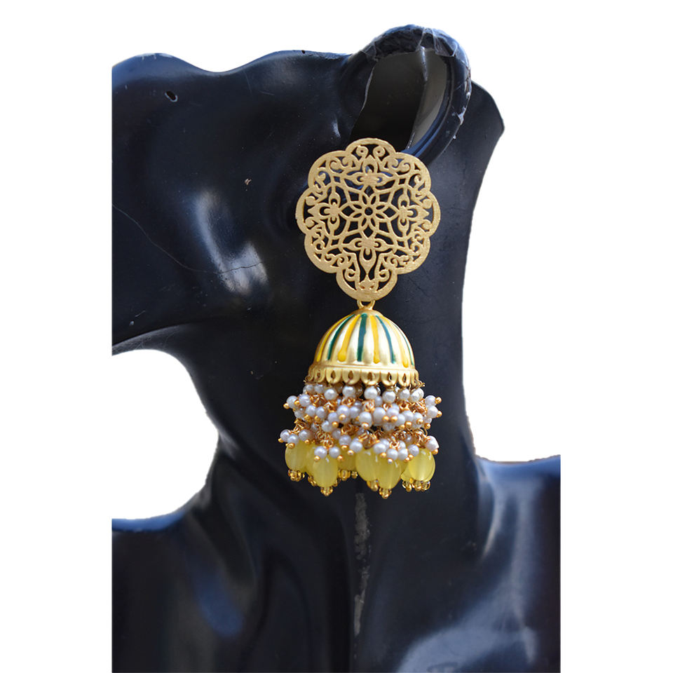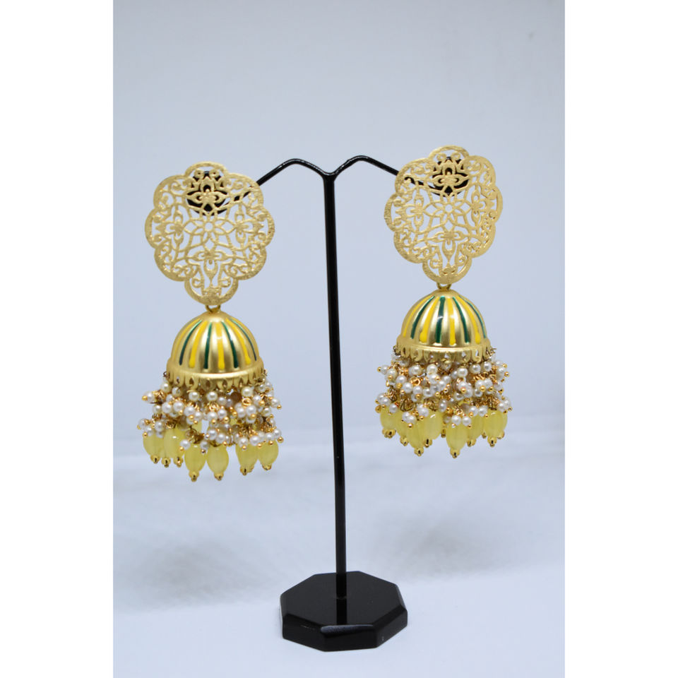 brass golden matte finishing partywear handmade meenakari beads jhumki with stud long hoop earing for girls and women