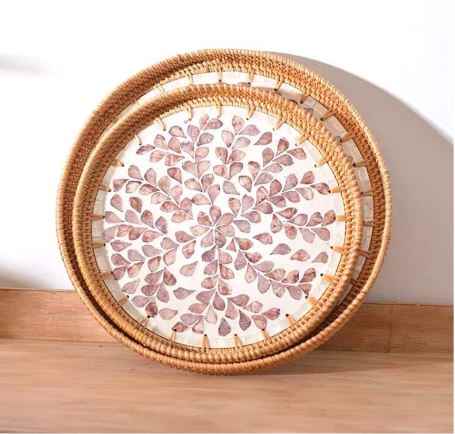 colorful shell inlay rattan storage tray - luxury handmade round basket plate for decorative ornaments and food tray