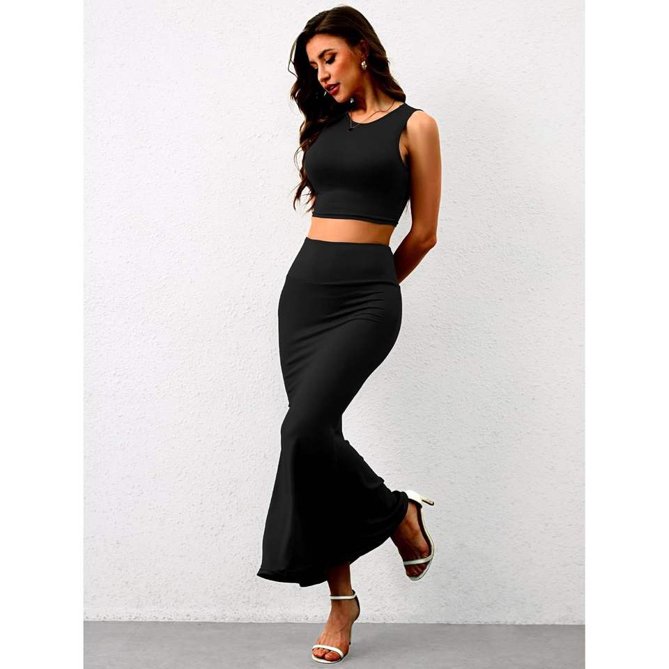 comodo7 Women's Sexy Summer 2-Piece Maxi Skirt Set Knit Bodycon Crop Tank Top & Mermaid Skirt Dress Short Length Top