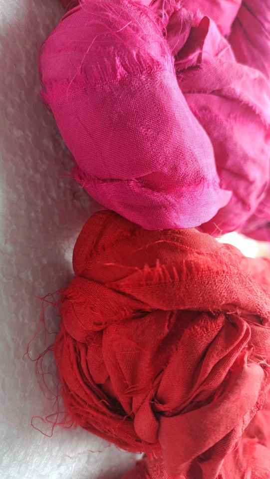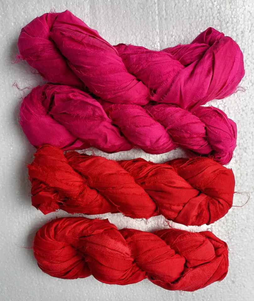 custom dyed sari silk ribbon yarns in pink and red colors made with premium quality recycled sari silk fabrics for crafts