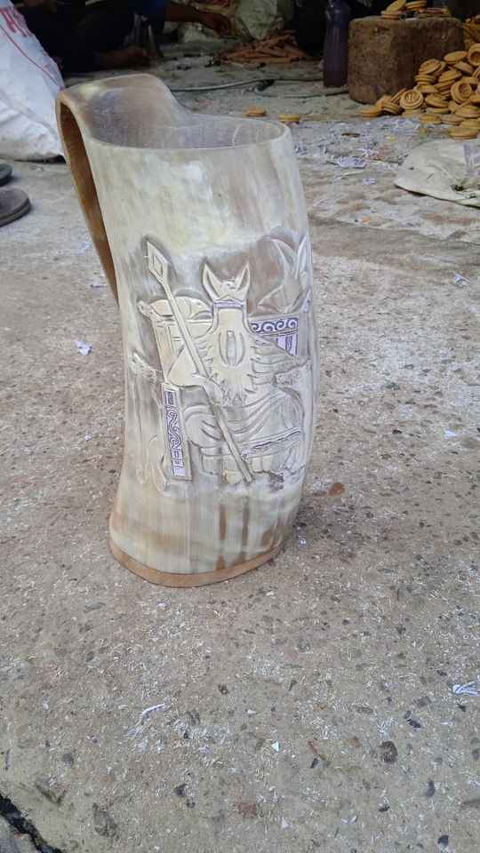 Custom Hand Carved Odeon Theme Drinking Horn Mugs and Glasses Suitable for Viking Themed Supply Stores for Resale