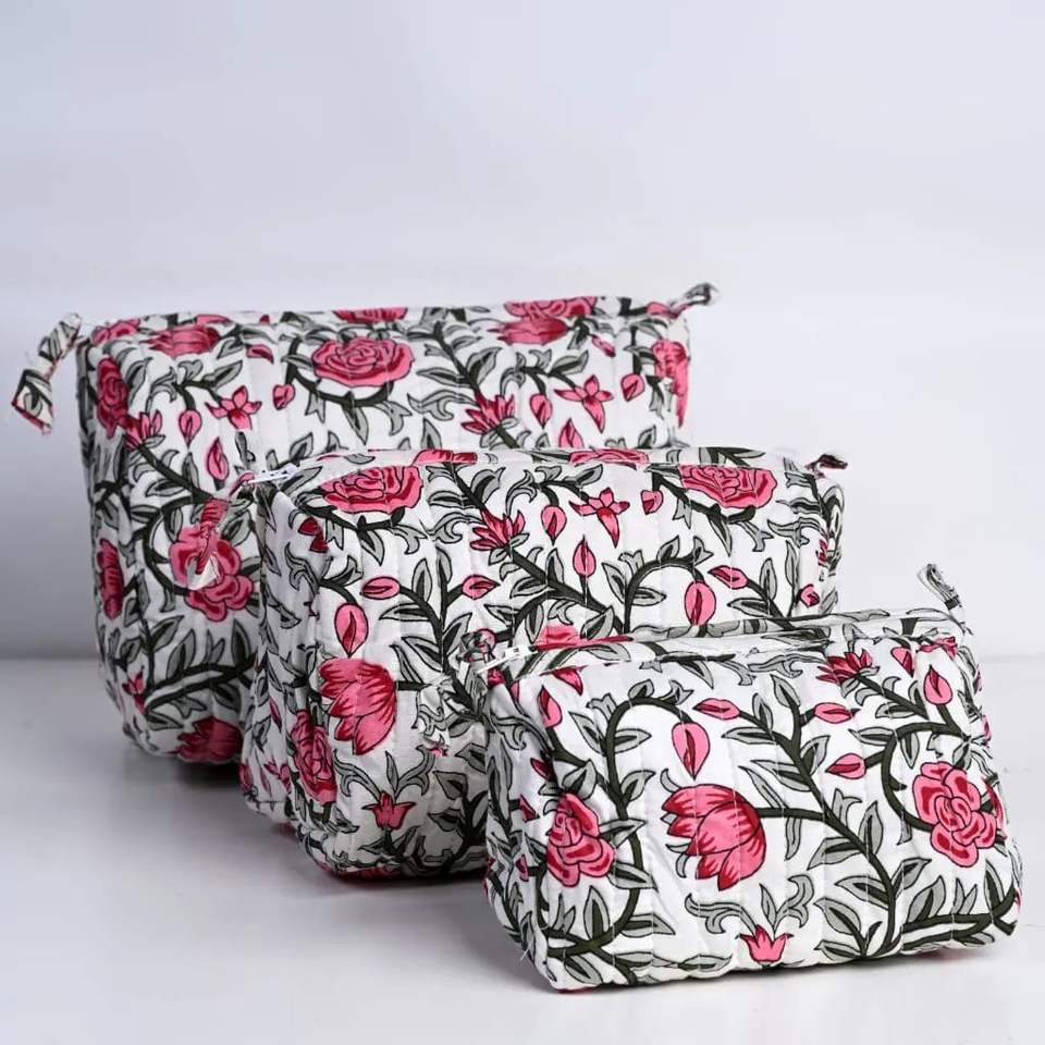 custom made cotton printed quilted kantha stitched 3 piece zippered pouch set ideal for home textile stores for resale