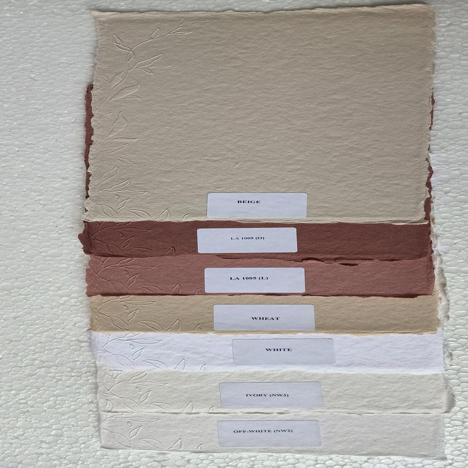 custom made deckle edged cotton rag handmade papers with embossing in multiple shades for wedding